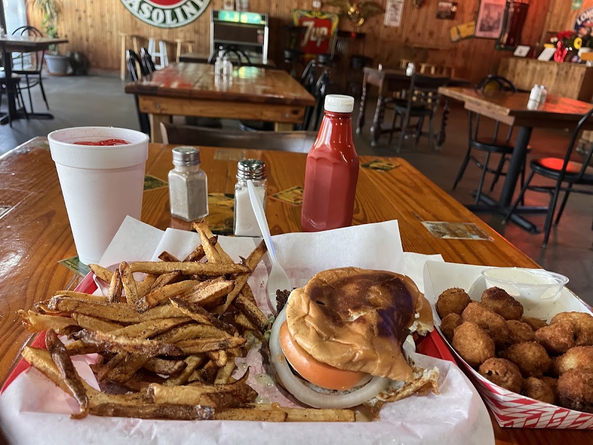 We found this restaurant randomly on Google and came because of the reviews. We were warmly greeted by Sam, the owner. We ended up getting a Mushroom Burger, Chili Burger and a BaconCheeseburger with Onions. Sam suggested that we get a single order of fries for the three of us to share and he said that he would give us half fries and half onion rings so we could try both. The rings were big and crispy and the burgers were huge! The fries were made in house from fresh potatoes so they weren’t as crispy as fast food fries. The dining room was decorated with vintage signs and it was exactly what I would expect from an old school texas burger joint. We will definitely be back!